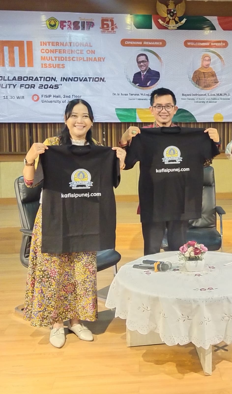 Acara launching kafisipunej.com ditandai dengan penyerahan kaos kafisipunej.com. Hadir pula dalam kegiatan sejumlah allumni FISIP Unnej, diantaranya Bawon Adi Yitoni, M. Khusnu, Yuyon Ali Fahmi, dan lainnya. (daud)